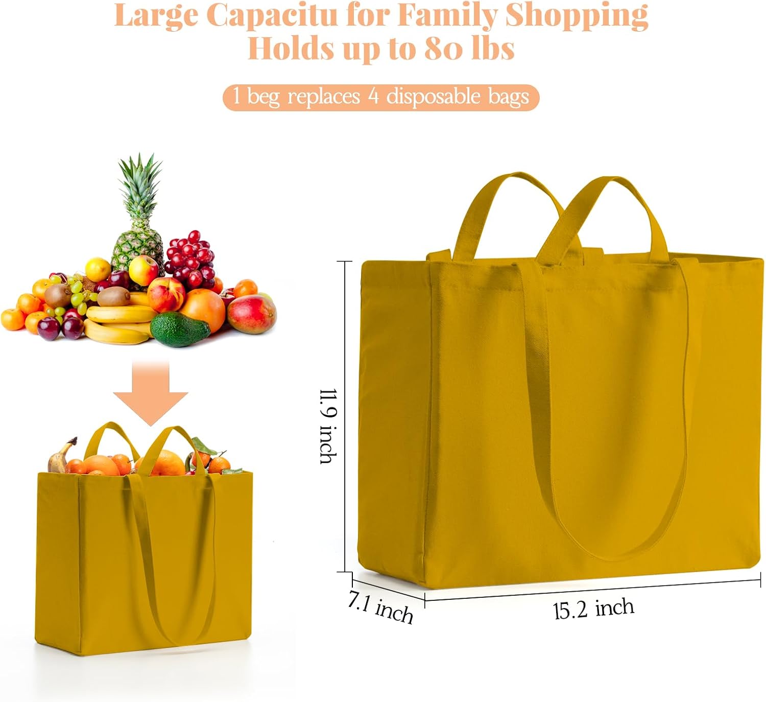 - 【DOES 80LBS OF SHOPPING BAGS FOR GROCERIES】 You’re about to find out extra large tote bag! Because these heavy duty reusable grocery bags are made from 12oz canvas, double stitched, reusable shopping bags with handles! And so each one of these organized grocery bags reusable shopping bags holds 80lbs! Load them up with as much as you want